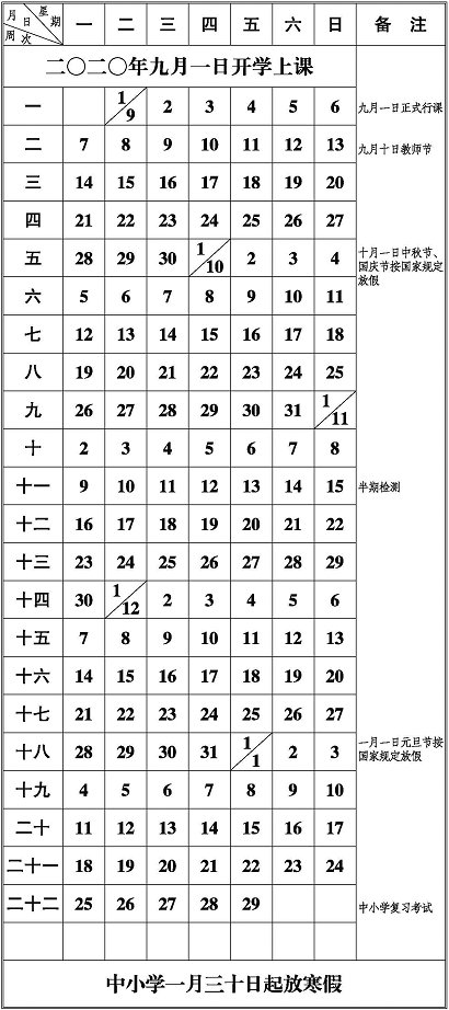 2020-2021重庆中小学校历最新 2020-2021重庆市中小学校历