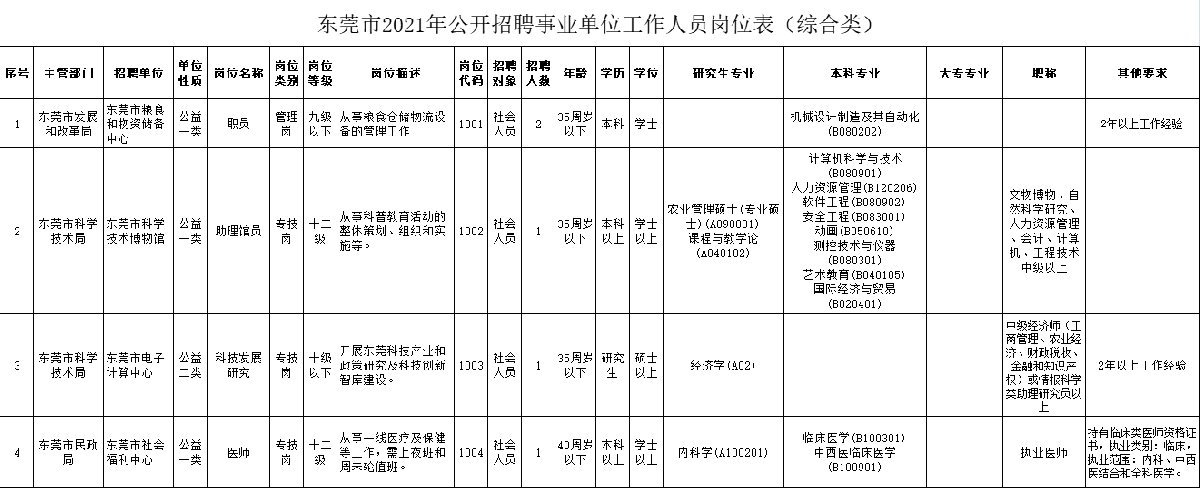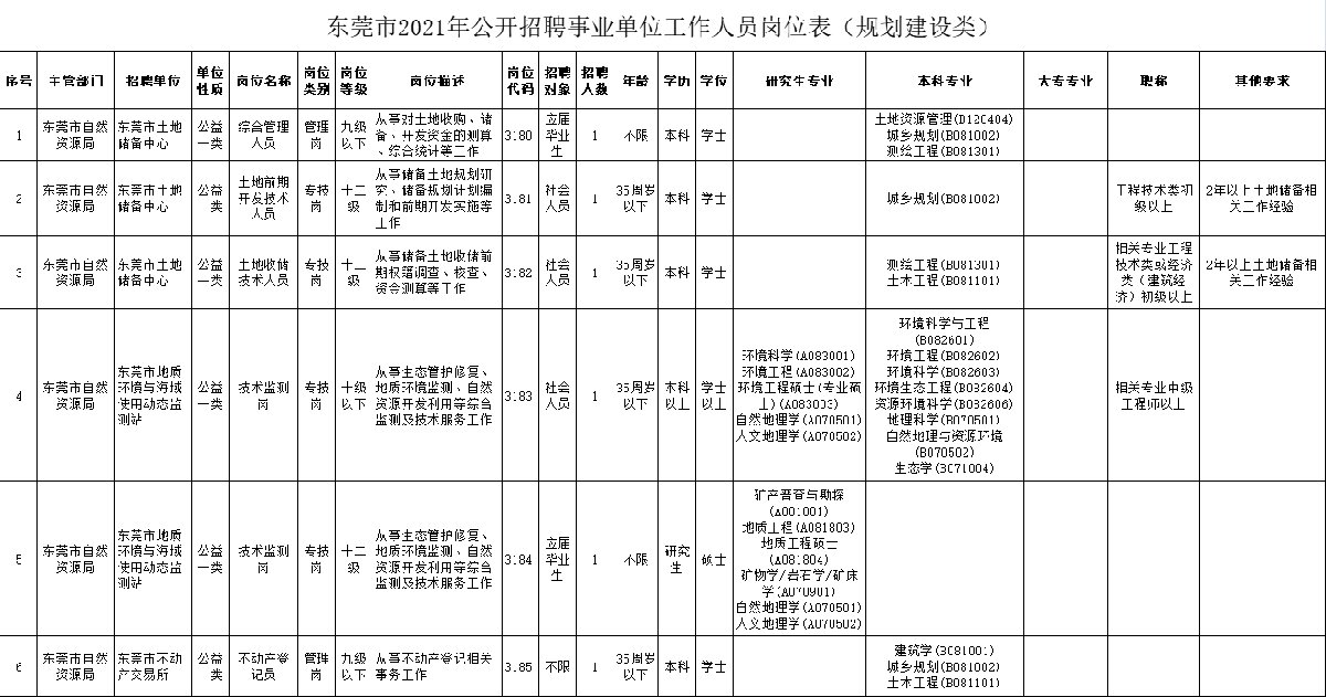 东莞市人社局发布了2021年东莞公开招聘事业单位工作人员招聘公告,职位表分为综合岗和规划建设岗。