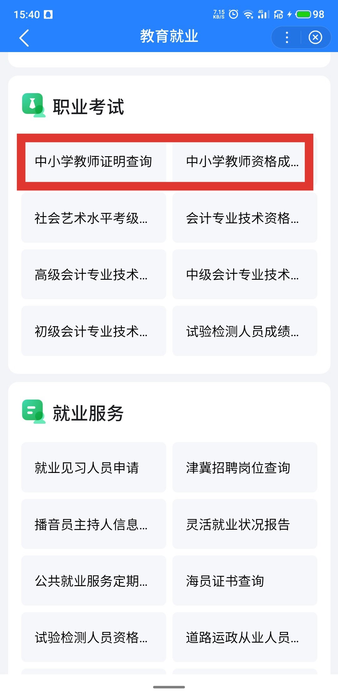 百度搜索『城市服务』小程序,点击进入后点击『教育服务』—『中小学教师资格证明查询』。