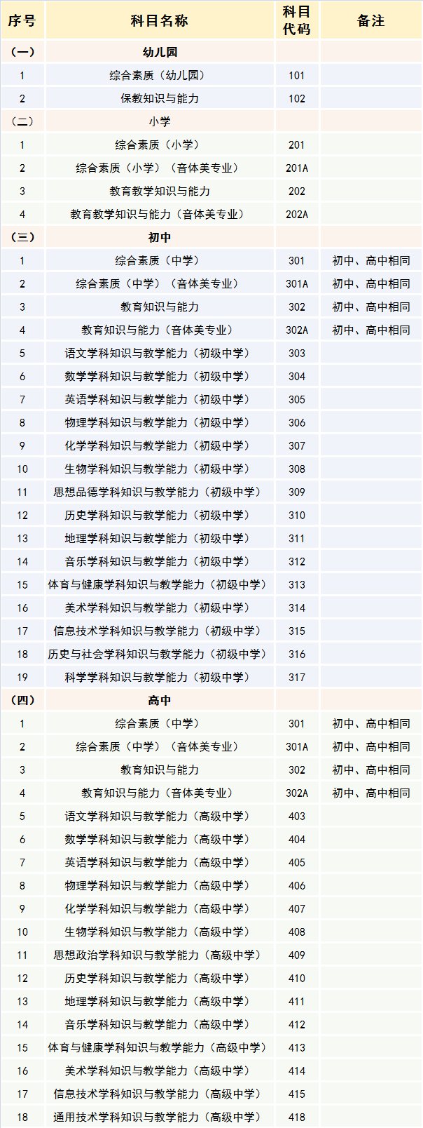教师资格考试(笔试)科目代码列表