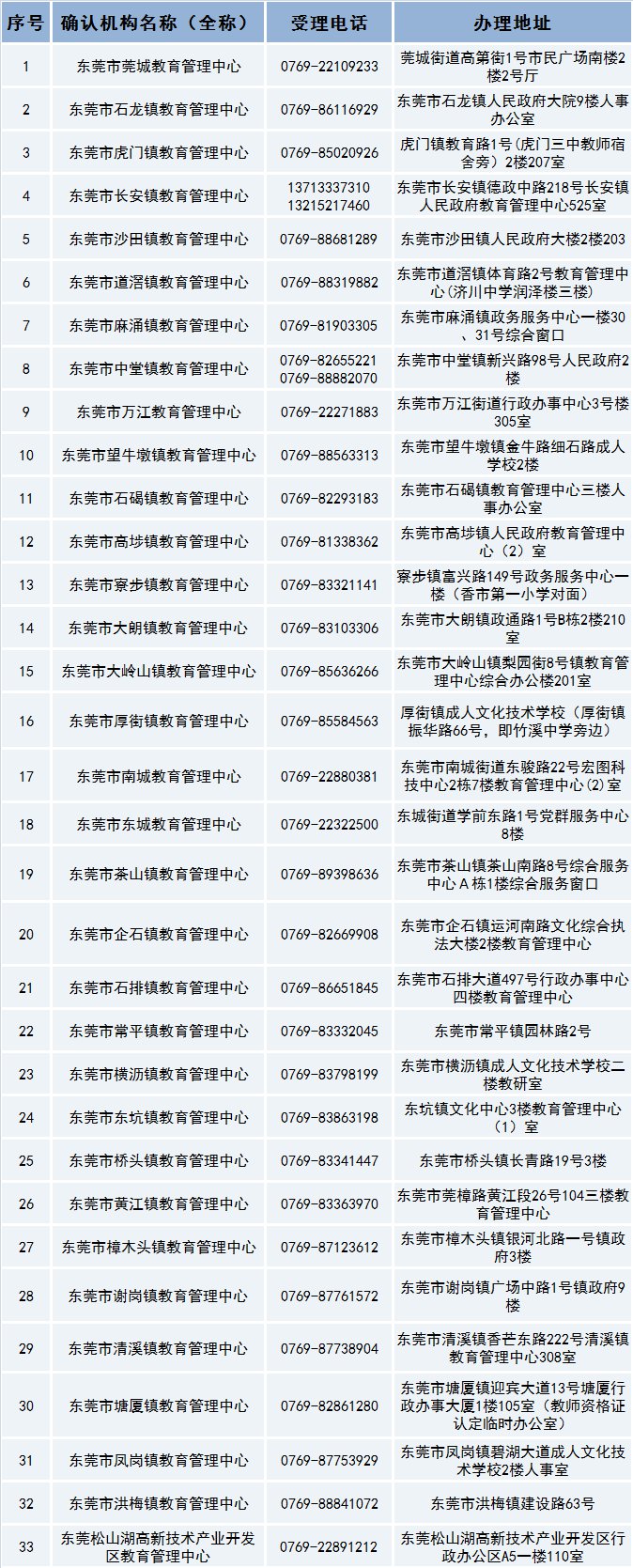 东莞市各教师资格认定现场确认点联系方式
