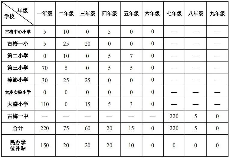 在录取安排入读公办学校的过程中,如果三个志愿均不能成功录取或未填报志愿的,则按我镇学校名称顺序(古梅中心小学、古梅一小、第二小学、第三小学、漳澎小学、大步实验小学、大盛小学),根据申请人积分自高到低依次调配到各学校的剩余学位中。如出现特殊情况,由镇教育管理中心统筹安排。
