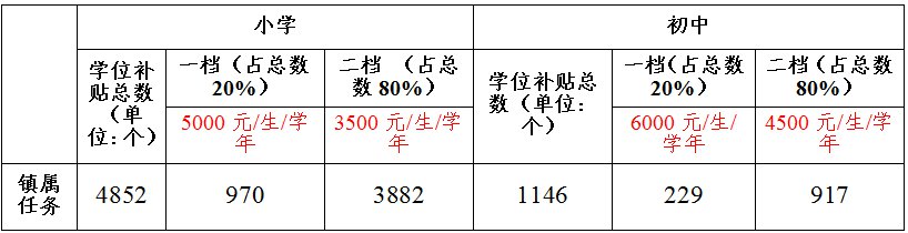 2.积分制民办学位补贴入围分数线划分。未被公办学校录取的申请人,我镇将按照积分从高分到低分排名,结合我镇民办学位补贴指标数,即小学4852个(含插班生),初中1146个(含插班生),确定入围民办学位补贴的申请人名单。按照市的要求,入围民办学位补贴的申请人,将根据积分排名及学位指标,按照补贴学位总数的20%、80%的比例,划分为两个档次,获取相应的学位补贴。即入围民办学校补贴的申请人,申请小学的,排名在1至970名的,按照5000元/生/学年的标准进行补贴;排名971至4582名的,按照3500元/生/学年的标准进行补贴;申请初中的,排名在1至229名的,按照6000元/生/学年的标准进行补贴;排名230至1146名的,按照4500元/生/学年的标准进行补贴。(注:以上补贴金额已包含免费义务教育公用经费补助和免费义务教育教科书补助)