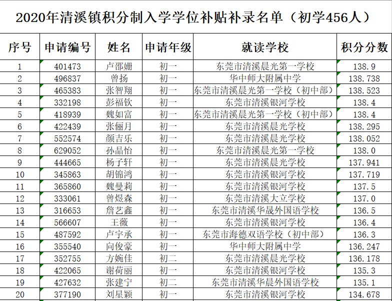 2020东莞清溪镇积分入学补录名单公告 2020年东莞清溪积分入学