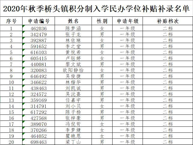 根据《东莞市非户籍适龄儿童少年接受义务教育实施办法》(东府〔2020〕31号)、《东莞市义务教育阶段非户籍适龄儿童少年积分制入学积分方案》(东府〔2020〕32号)《东莞市教育局 东莞市财政局非户籍适龄儿童少年积分制入学民办学位补贴实施办法》(东教〔2020〕2号)的有关文件规定,因有部分获得学位补贴资格的学生放弃学位补贴,现顺延录取,开展我镇积分入学学位补贴工作, 现将有关要求和名单公告如下: