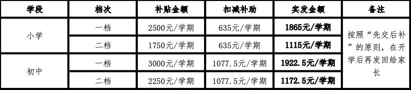 一档学位补贴标准:小学每生每学年5000元,初中每生每学年6000元;二档学位补贴标准:小学每生每学年3500元,初中每生每学年4500元(以上标准均含免费义务教育公用经费补助和免费义务教育教科书补助“小学635元/生/学期,初中1077.5元/生/学期”)。小学、初中一档、二档学位补贴实际发放金额如下: