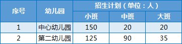 2021年秋季,中心幼儿园小班计划开设6个教学班,计划招生150人;第二幼儿园计划开设9个教学班,其中,小班开设5个教学班,计划招生125人;中班开设3个教学班,计划招生90人;大班开设1个教学班,计划招生35人