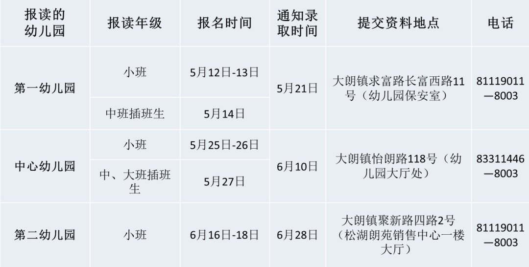 1.第一类省市优惠政策群体人员,请于5月12日至13日(上午:8:30-12:00;下午:2:30-5:30),携带已填好的《大朗镇公办幼儿园幼儿入读申请表》及下文(第五点)中要求的资料到大朗镇教育管理中心(政通路1号B栋2楼)212室进行现场报名(咨询电话:83018830)。