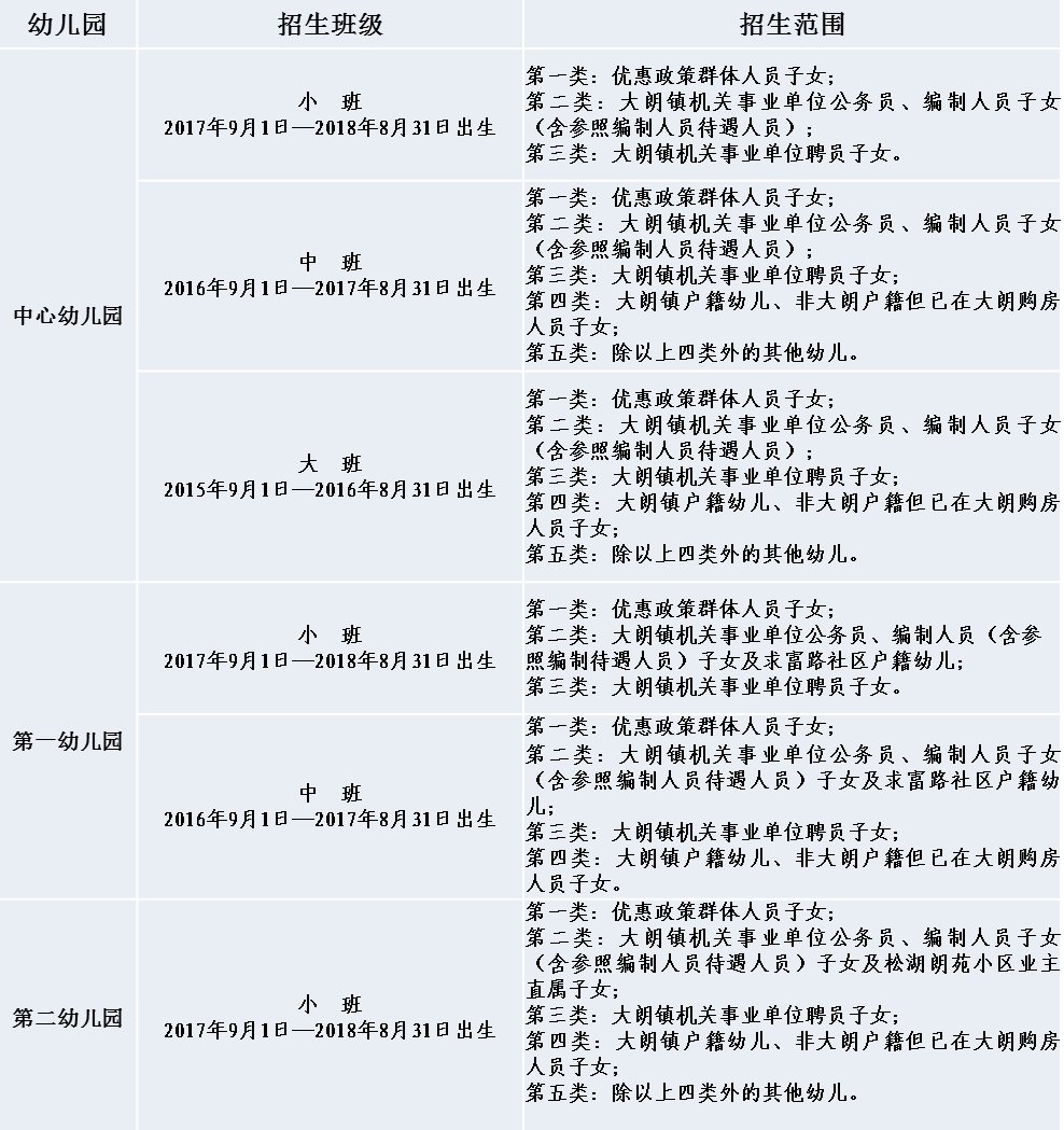 大朗镇目前共有三家公办幼儿园,根据各园的实际情况,按照各园招生范围类别(见下表)进行招生。按照类别顺序进行录取,即先从第一类幼儿开始进行录取,如仍有学位,再录取第二类幼儿,依此类推。录取时不论是哪一类,如出现人多位少的情况,此类人员进行抽签,抽签或录取完该类后已无学位,则该园该年级招生即止。