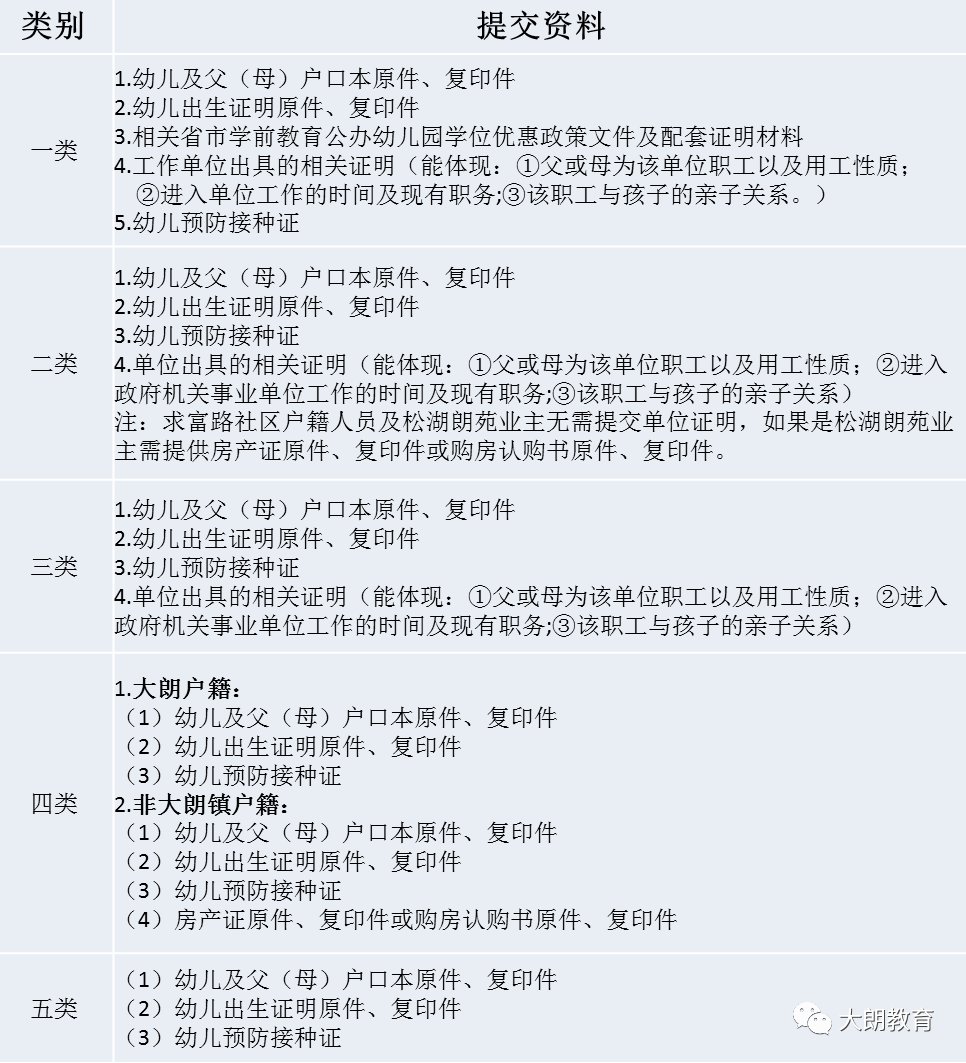2.第二、三、四、五类别人员,请携带已填好的《大朗镇公办幼儿园幼儿入读申请表》及下文(第五点)中要求的资料按以下安排到指定地方递交资料报名(受理时间:上午9:00-11:30,下午2:00-4:00),具体如下: