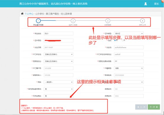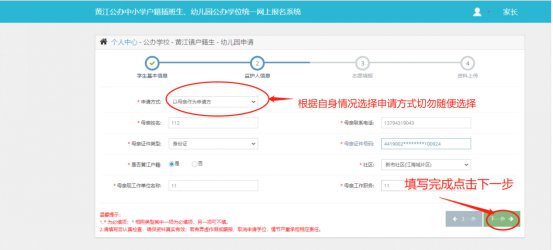 2.3.1监护人信息填写页面,将必填的信息填写完成之后点击“下一步”进入下个模块。(图2.3.1)
