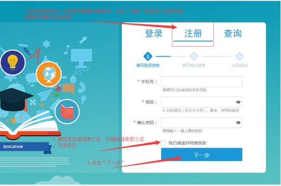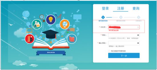 1.2 若是首次进入系统,则需注册账号(图1.2),点击“注册”跳转注册页面,按照要求填写信息,其中,若手机号已经在本系统注册过则会提示。(图1.2.1)