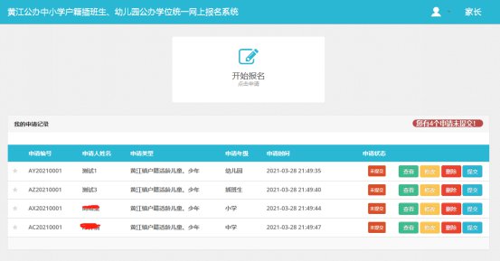 点击“保存”申请信息后,系统自动跳转到申请主页面,如果信息填写有误,点击页面的“修改”按钮进行修改,修改完成之后点击下一步进入到资料提交页面再点击“保存”(重复上一步的“保存”步骤),确认信息无误,点击对应记录的“提交”按钮即可提交该条申请,提交之后不可在对该条信息进行修改。(图3.1)