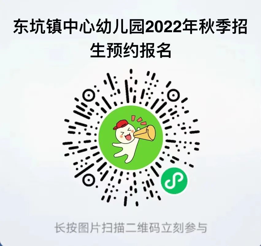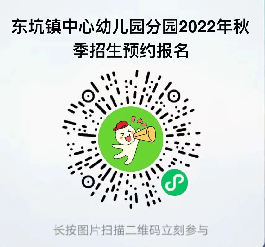 4.报名方式为了落实疫情防控工作,避免家长扎堆排队,方便广大家长选择出行时间,本次递交2022年入园报名资料采用网上预约方式。(1)准备流程如下:下载入读报名表→填好报名表→准备好资料→网上预约递交资料时间→携带相关资料,于预约时间到各幼儿园报名。(2)网上预约时间:5月29日-5月31日(3)现场报名递交资料时间:6月4日-6月5日(4)进入“东坑智教育”微信公众号,在《东坑镇2022年公办幼儿园秋季招生公告》中的二维码自行下载《东坑镇中心幼儿园总园入读报名表》《东坑镇中心幼儿园分园入读报名表》《东坑镇实验幼儿园入读报名表》。