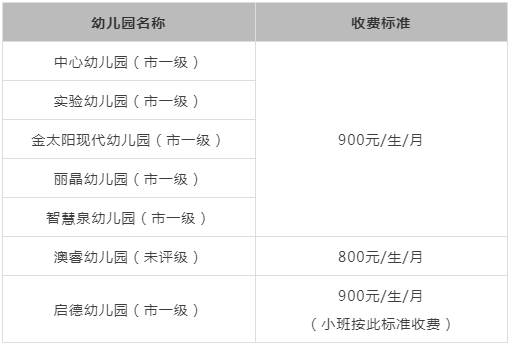中心幼儿园:82809678实验幼儿园:88009928金太阳现代幼儿园:83389669丽晶幼儿园:83381152智慧泉幼儿园:81179596澳睿幼儿园:83866838启德幼儿园:82326288九、保教费收费标准