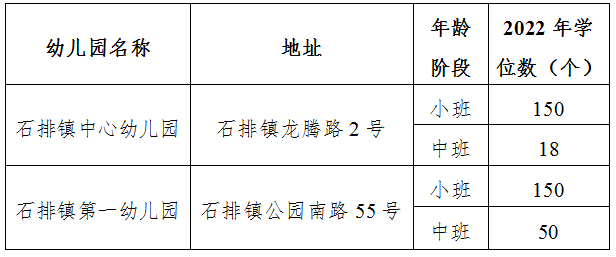 2022年石排镇公办幼儿园秋季招生即将开始。为顺利开展今年的招生工作,现制定招生简章如下: