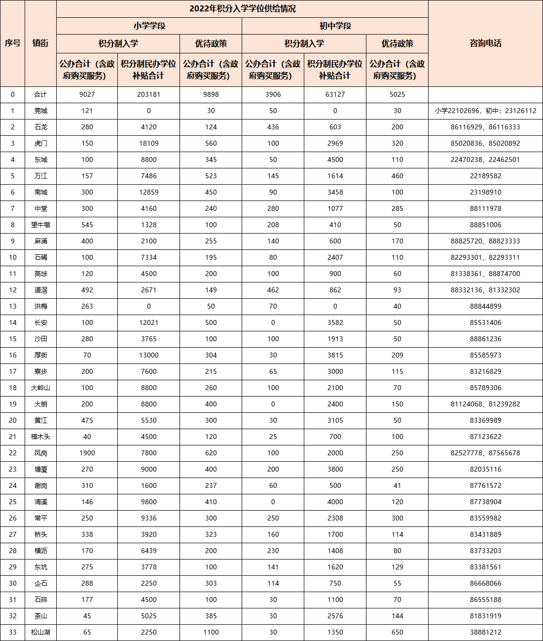2022东莞积分入学各镇区学位数一览 2021东莞小学入学学区划分