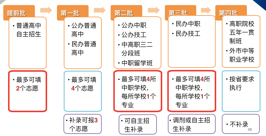 各类学校的志愿批次分为五批,考生应按批次顺序填报志愿。