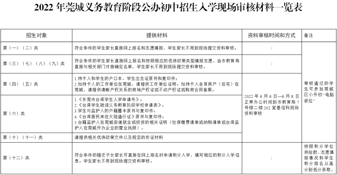 符合招生对象第(四)(五)(六)(十)(十一)类之一的小学应届毕业生,请于2022年6月6日—6月8日正常办公时间带齐相关证明材料(见下表)到东莞市教育局7号楼二楼202室基信科进行现场资料审核,逾期不再受理(地址:东城区八一路1号东莞市机关二号大院)。其余类别由相应部门审核并推送名单或审核结果给市教育局基信科,家长不用现场提交资料审核。