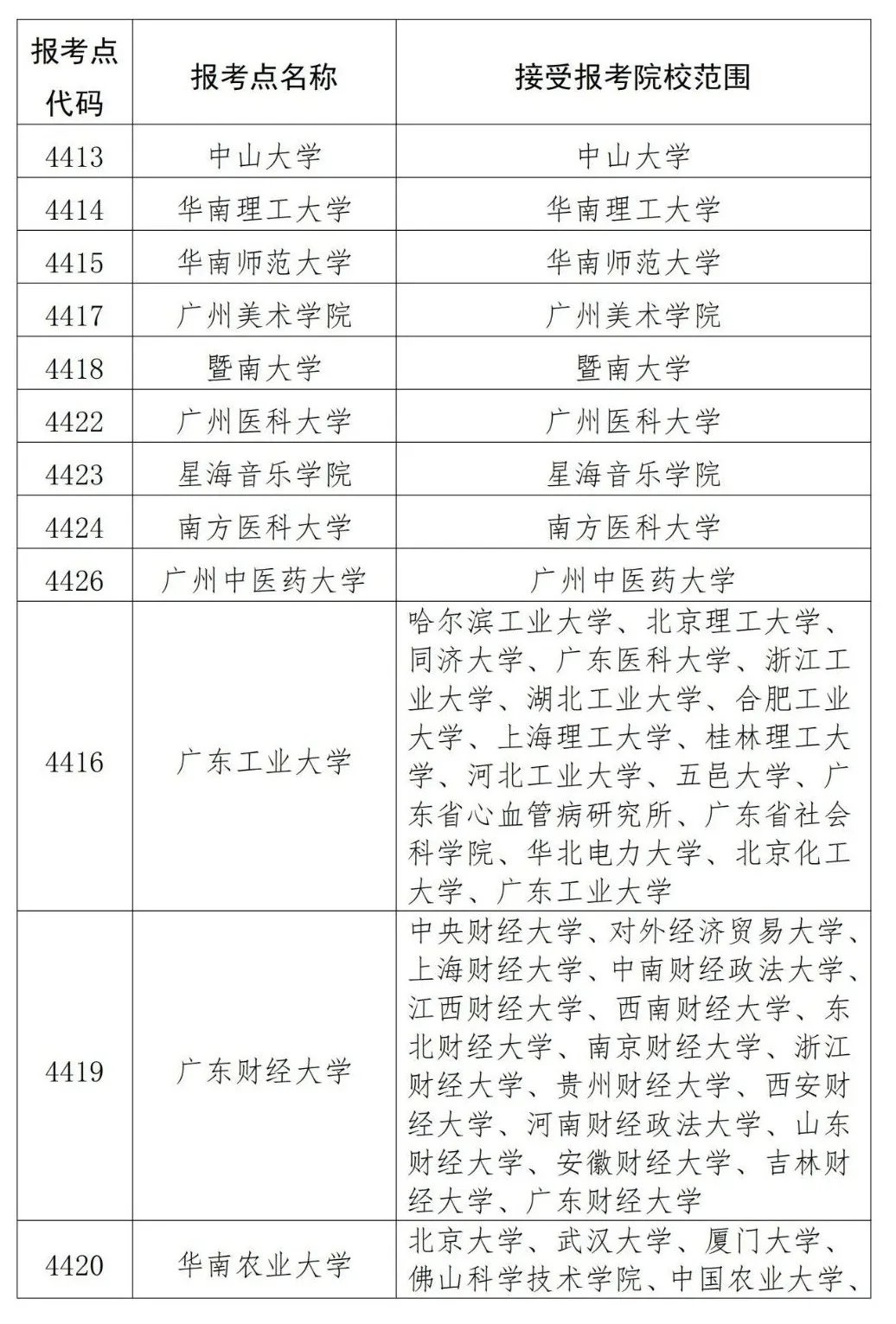 (二)拟在广东省报考的考生在选择报考点时须严格遵守报考点接受范围,否则报名结果无效。具体如下: