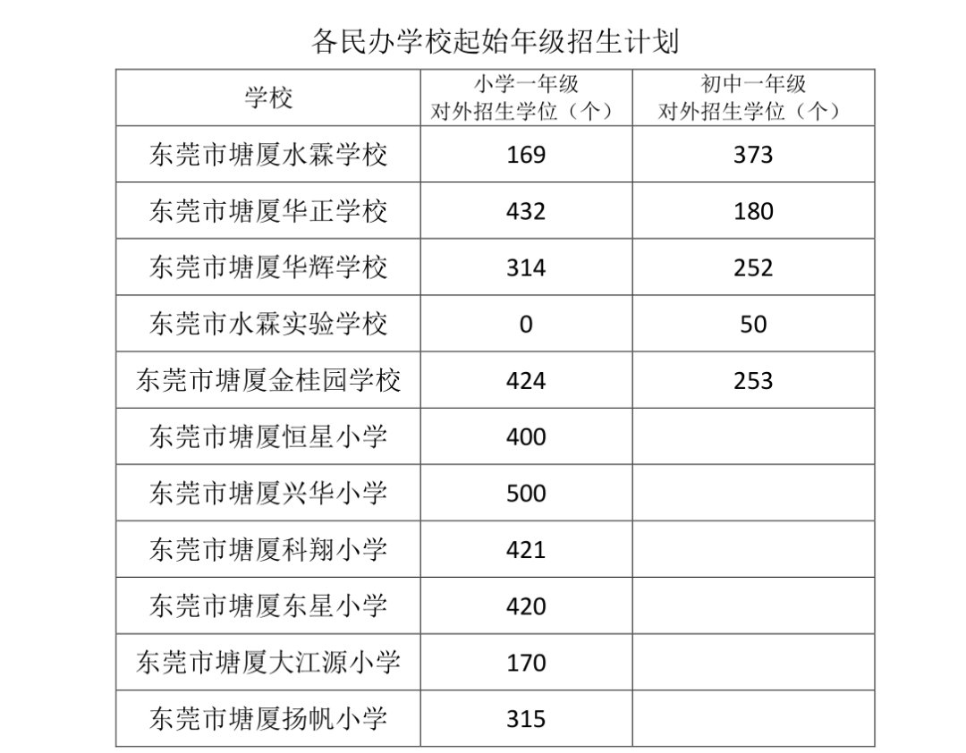 2021年塘厦镇各民办学校起始年级招生计划如下:
