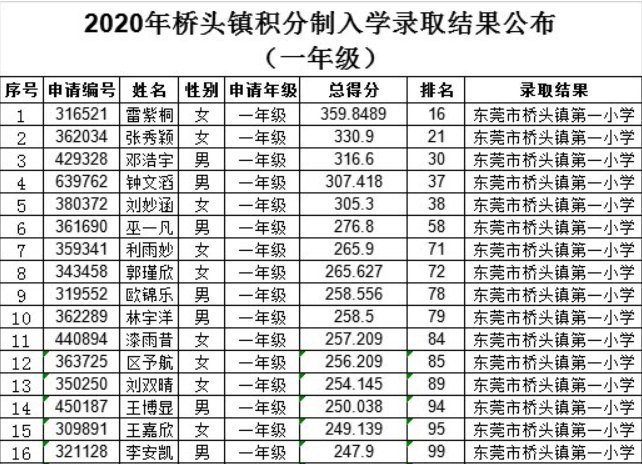 完整名单点击:2020年桥头镇随迁子女积分制入学积分公示
