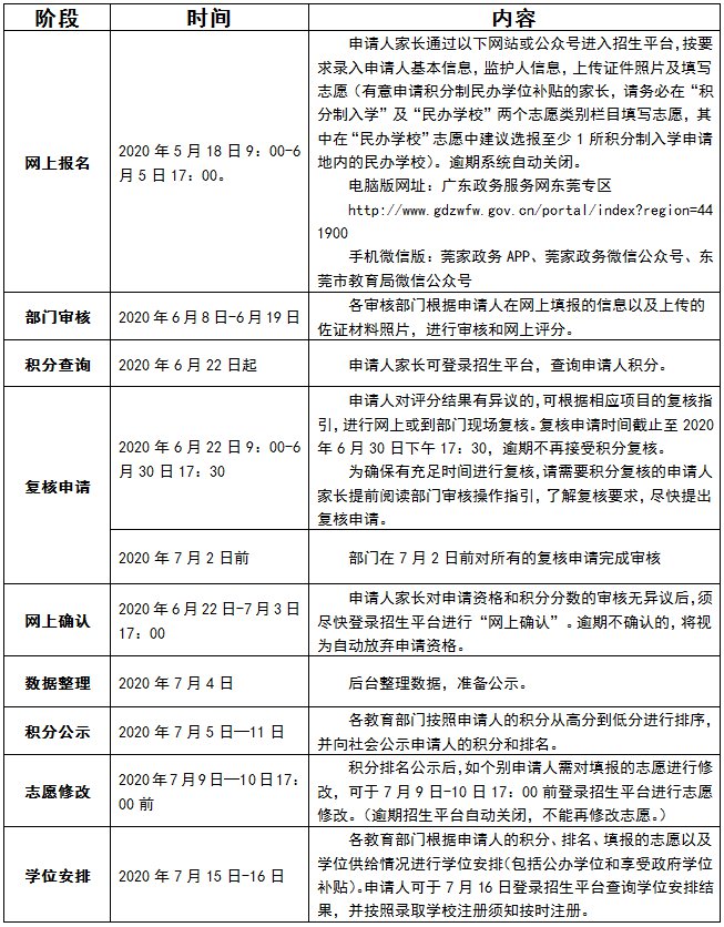 根据《东莞市义务教育阶段非户籍适龄儿童少年积分制入学积分方案方案》,积分入学申办程序包括公布学位、网上报名、资料初审、审核评分、积分查询、网上确认、积分公示、学位安排八大申办程序。