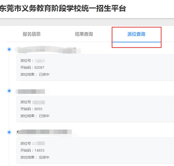 报读了东莞外国语学校和有关民办学校的学生家长,可于2020年7月11日起登录“东莞市义务教育阶段学校统一招生平台”(简称“招生平台”),在“派位查询”页面查询个人预录取结果。