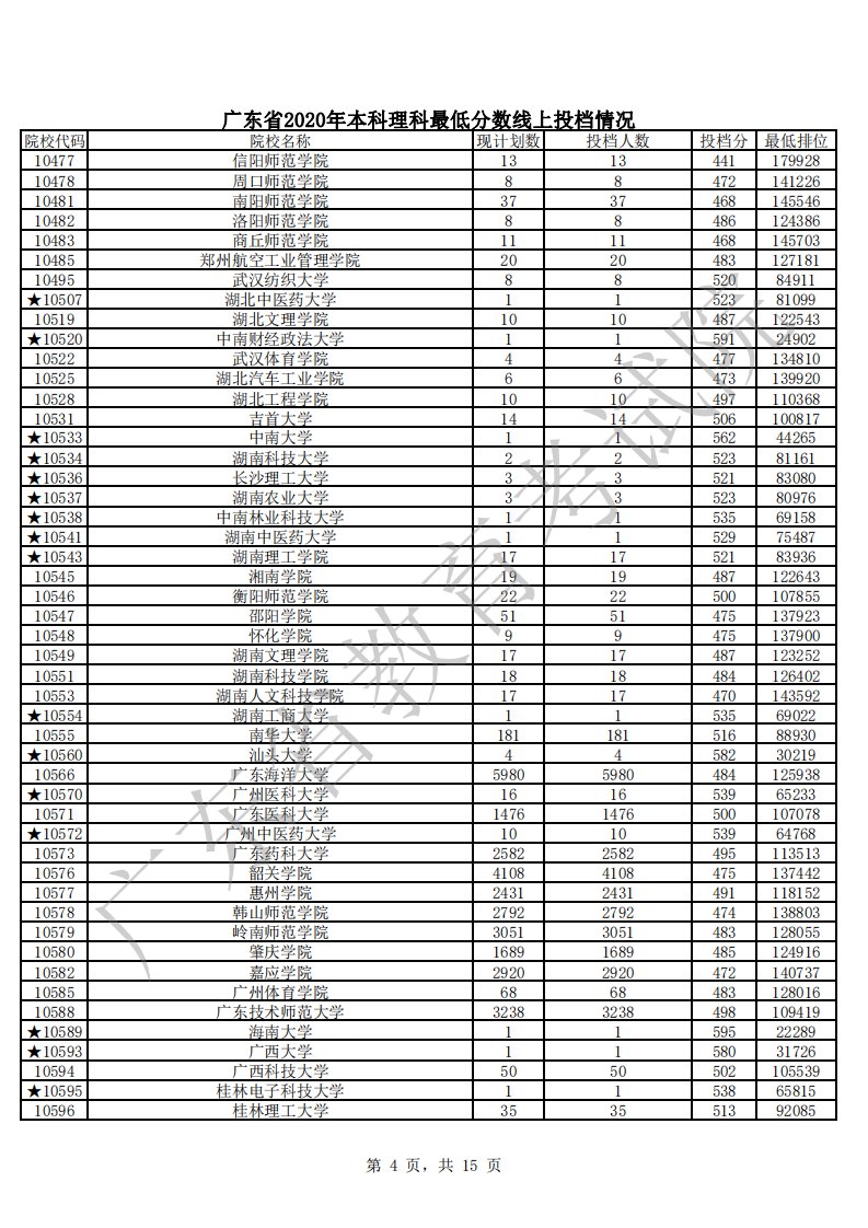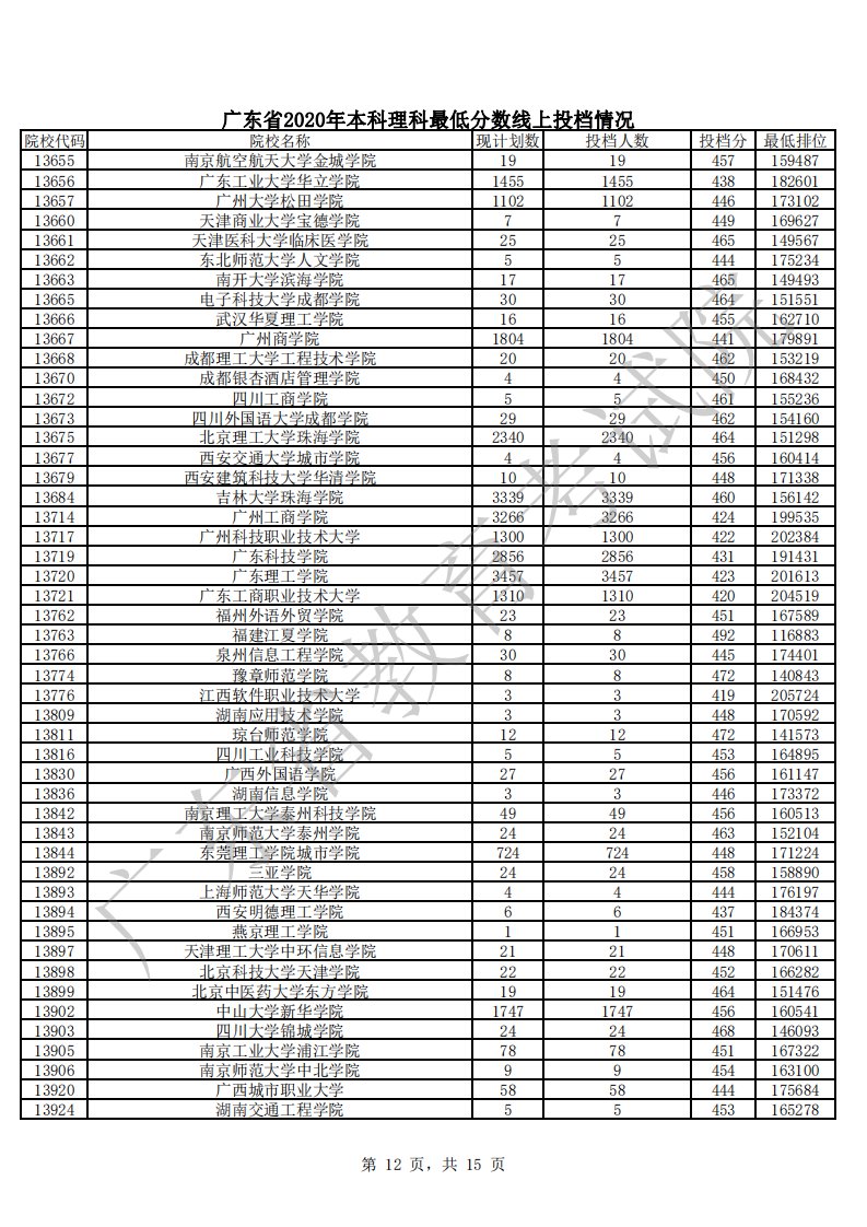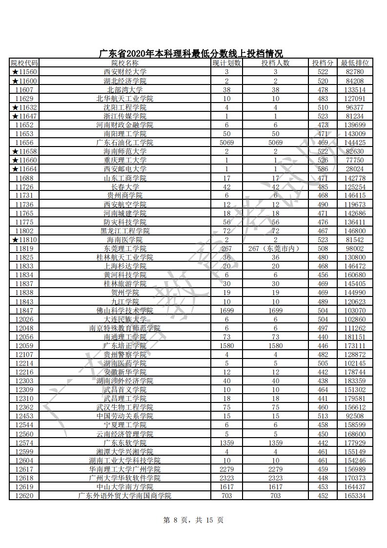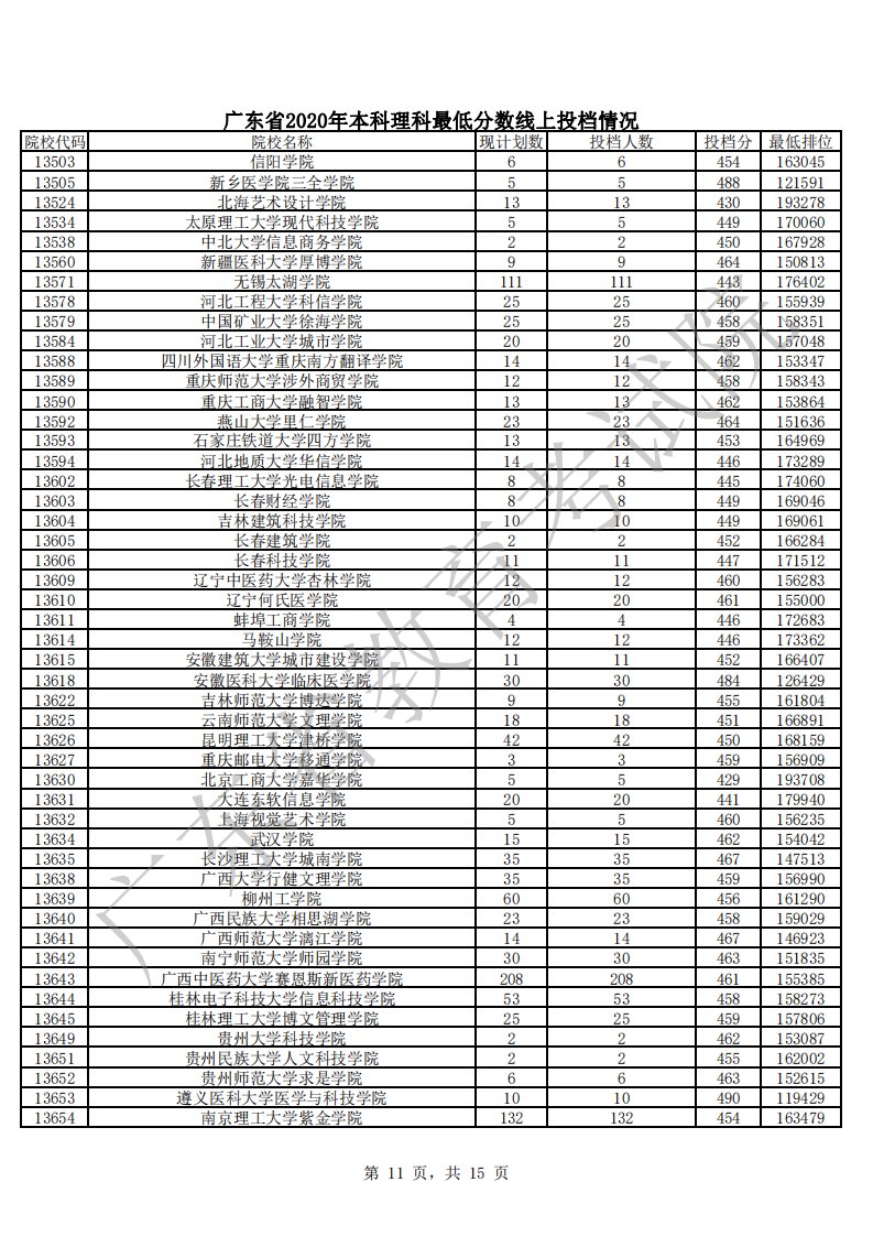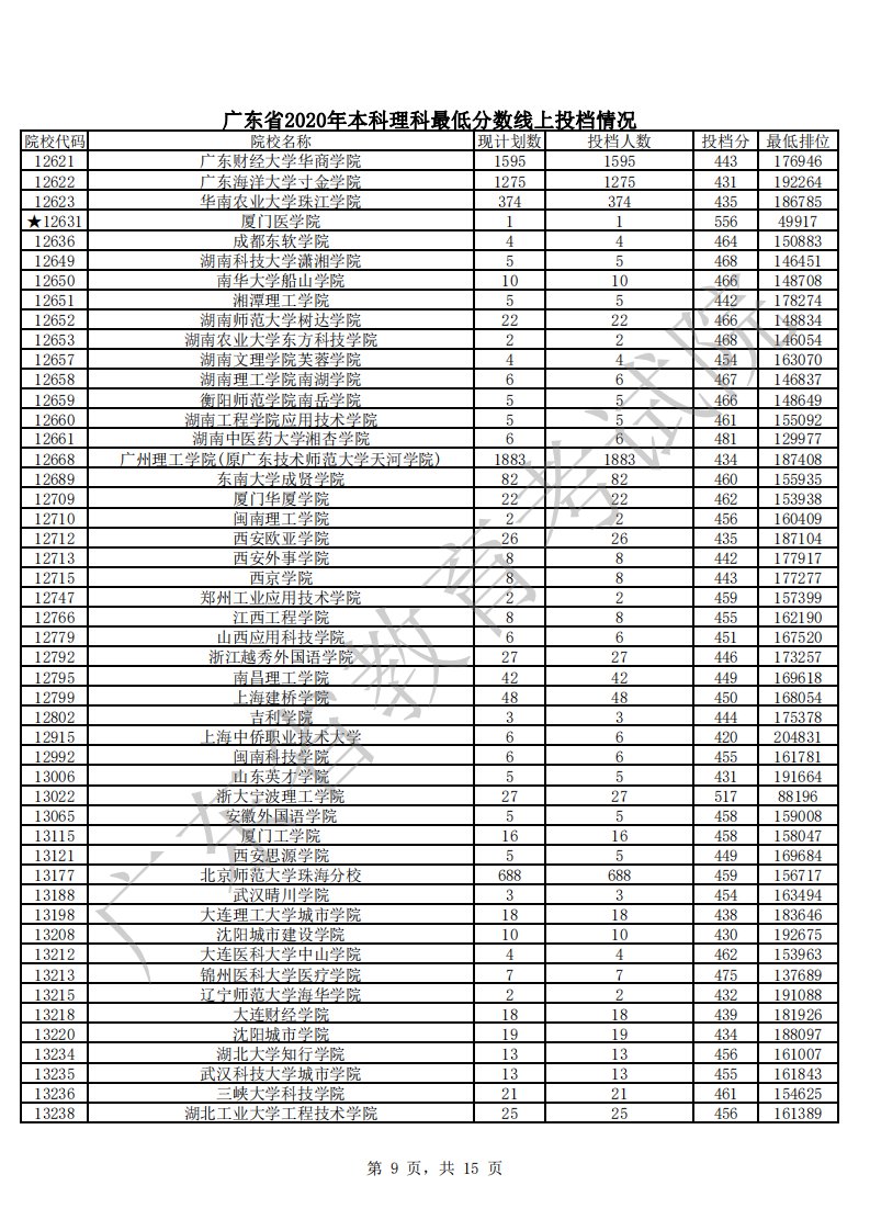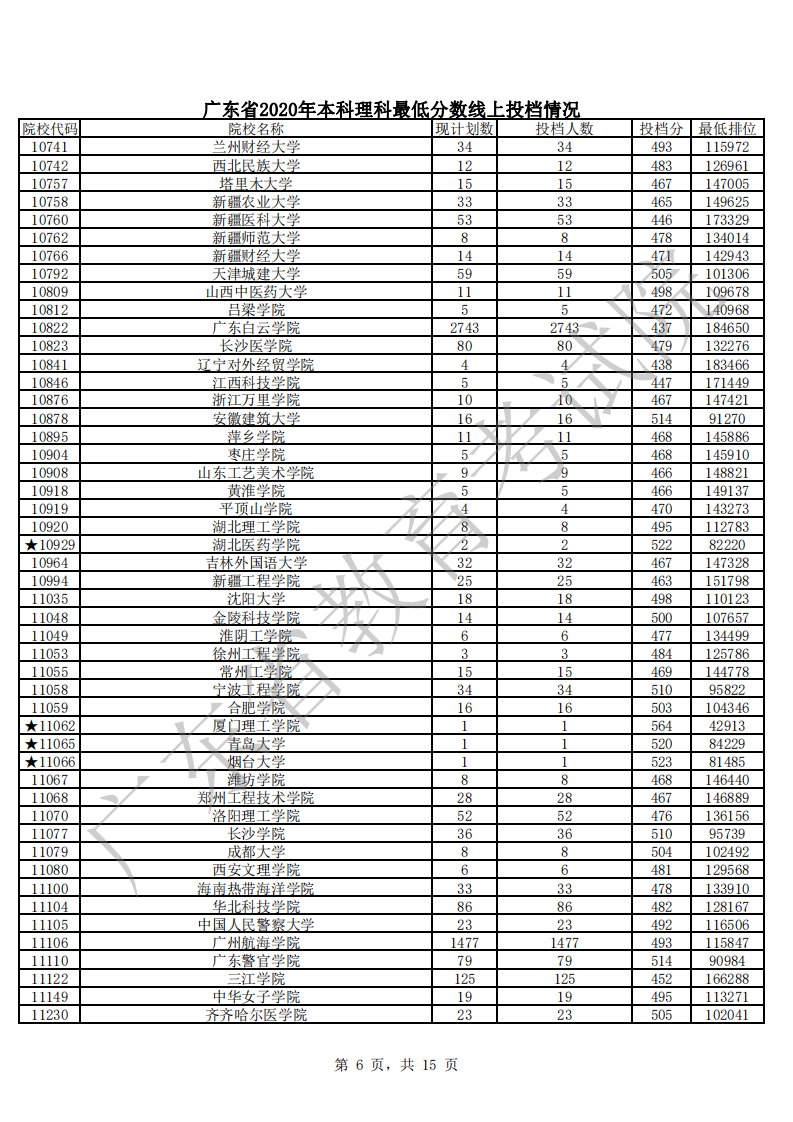 广东省2020年本科理科最低分数线上投档情况