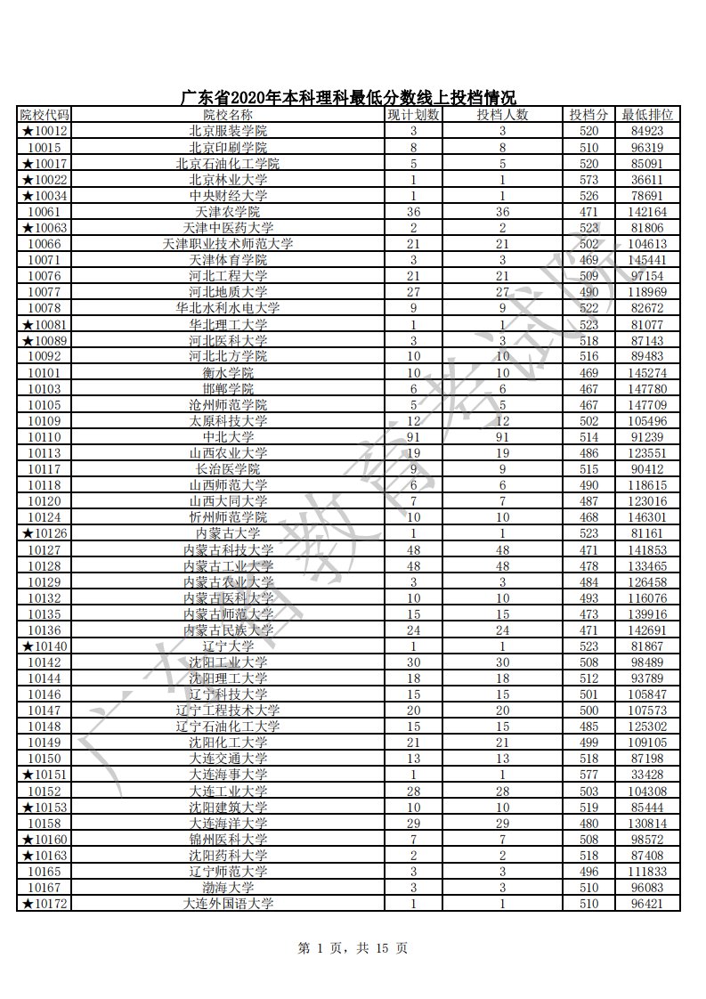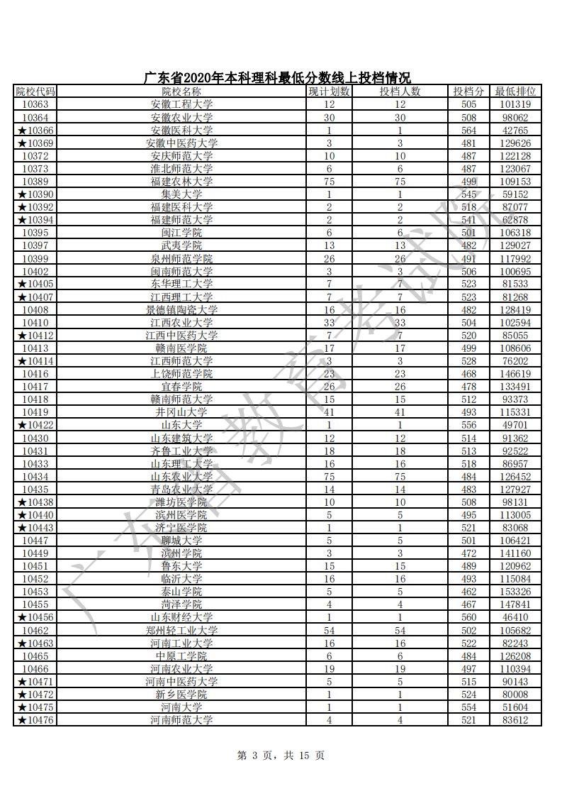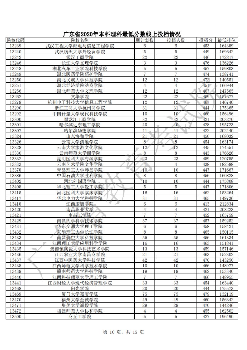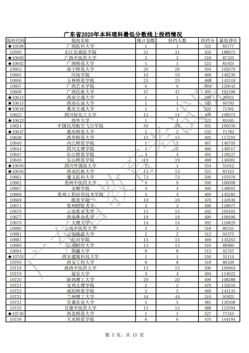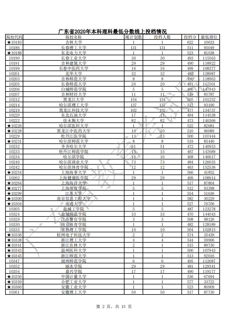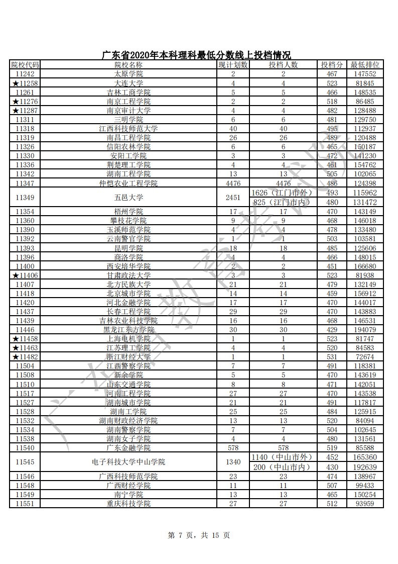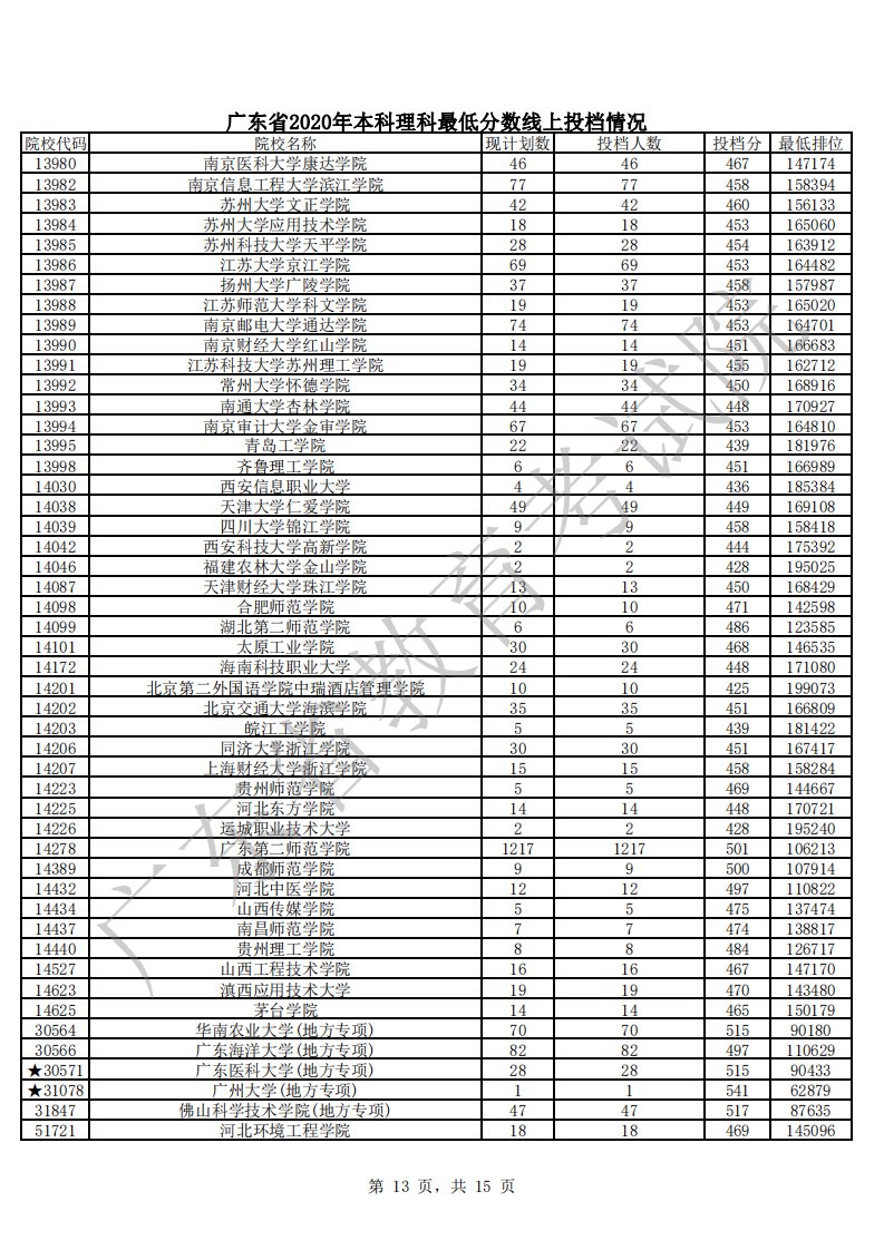 广东省2020年本科理科最低分数线上投档情况