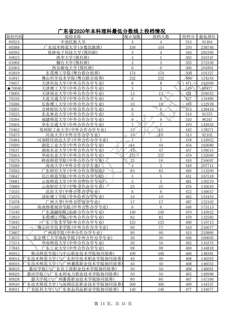 2020广东高考理科本科最低分数线投档情况