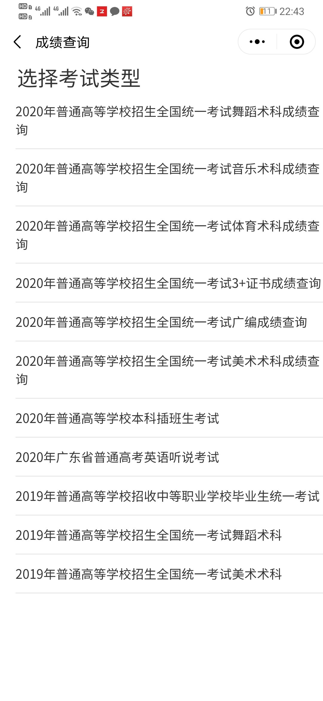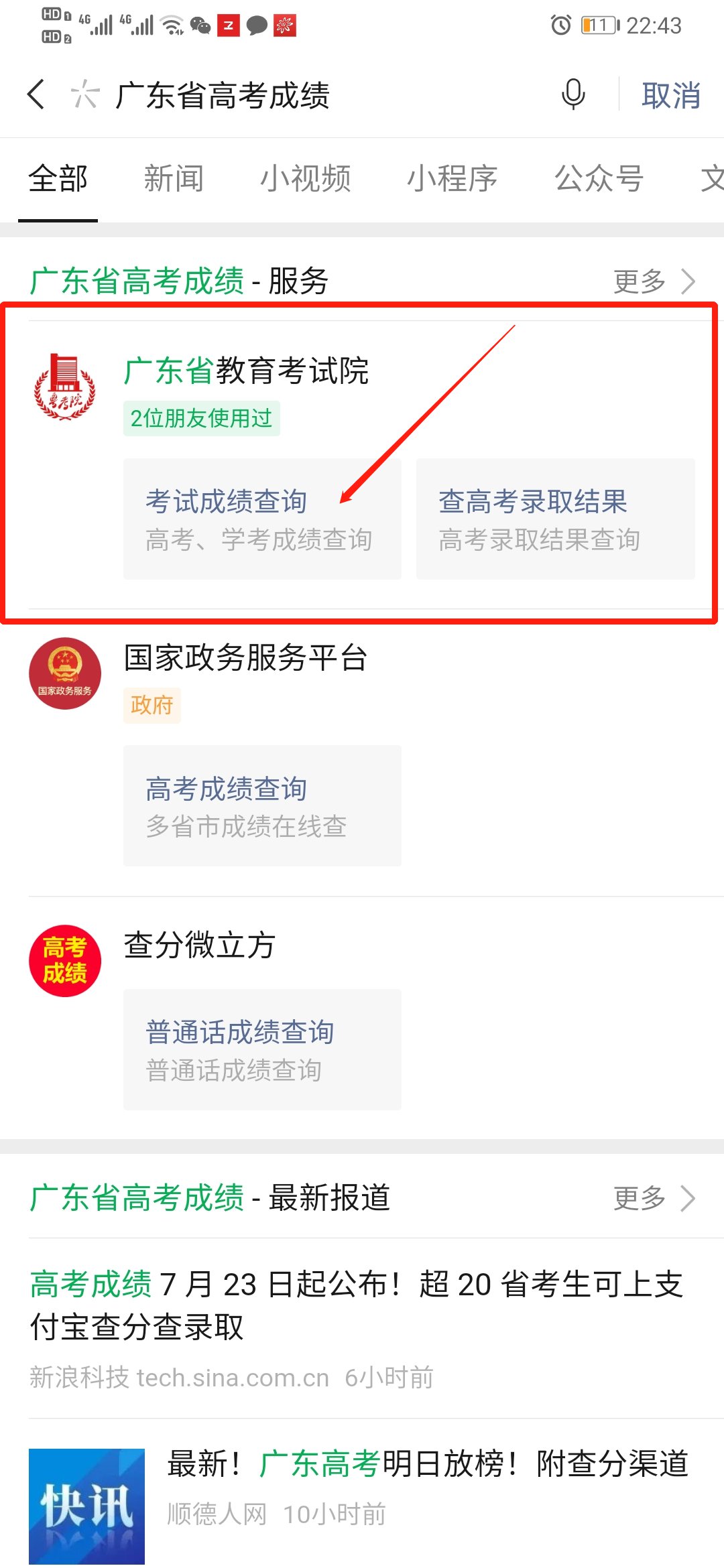 第一步:微信搜索“广东省高考成绩”随后点击“广东高考成绩查询—服务”中的“考试成绩查询”(如下图所示)