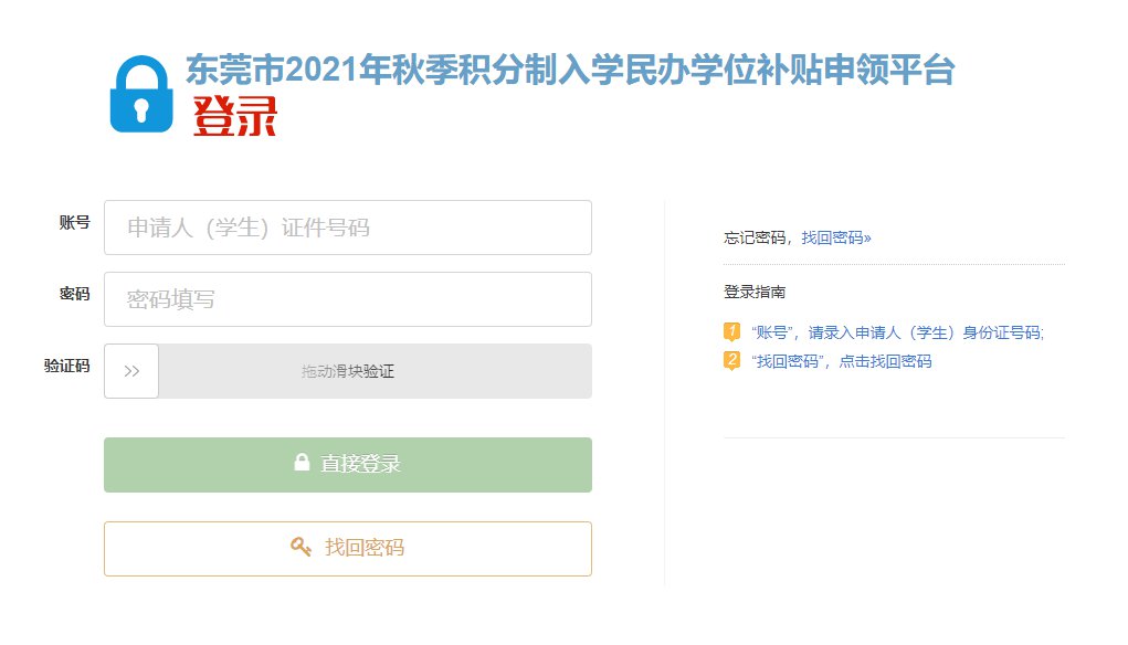 (1)新获得2021年民办学位补贴资格的学生的登录密码为今年在“东莞市义务教育阶段学校统一招生平台”报名时登录使用的密码;