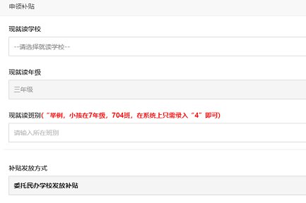 (一)首次申领学位补贴:以前没有申领过学位补贴,本学期首次获得学位补贴资格,请先在系统上填写目前的就读信息。其中“现就读学校”只能选择申请地民办学校,“现就读班别”请录入数字,如1,2,3…..。