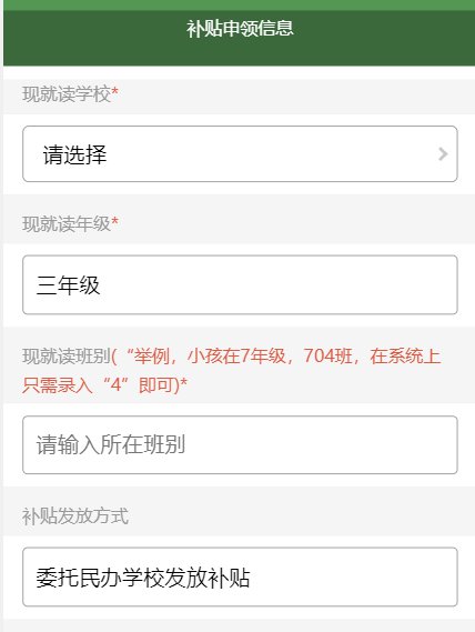 (一)首次申领学位补贴:以前没有申领过学位补贴,本学期首次获得学位补贴资格,请先在系统上填写目前的就读信息。其中“现就读学校”只能选择申请地民办学校,“现就读班别”请录入数字,如1,2,3…..。