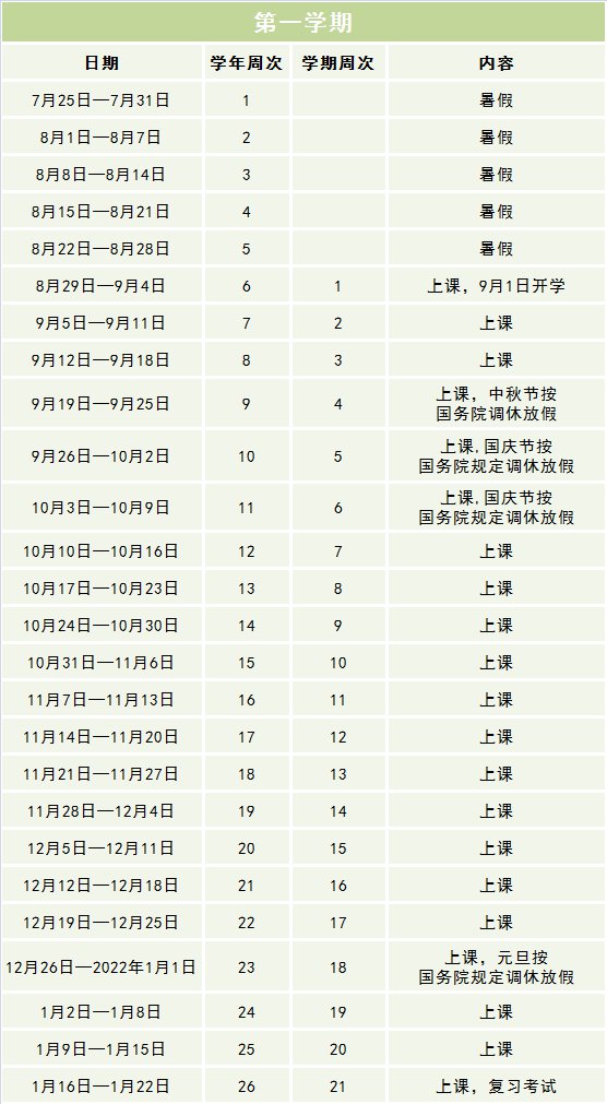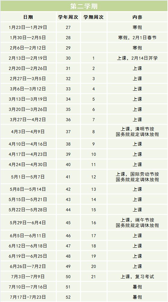 全学年52周,学生在校时间共42周(含法定节假日),其中教学安排时间40周,社会实践和劳动技术2周(由学校根据具体情况自行安排,可用于安排学校传统活动、文化科技艺术节、运动会、社会实践等)。