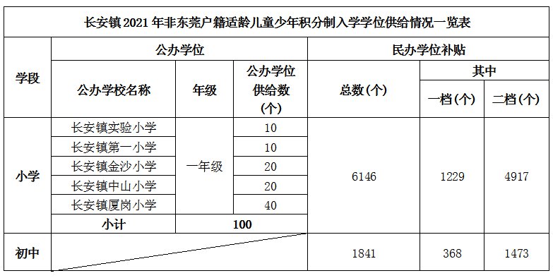 为更好解决我市非户籍适龄儿童少年接受义务教育问题,根据《东莞市非户籍适龄儿童少年接受义务教育实施办法》(东府〔2020〕31号)和《东莞市义务教育阶段非户籍适龄儿童少年积分制入学积分方案》(东府〔2020〕32号)有关精神和要求,现将长安镇2021年积分制入学学位供给情况公布如下: