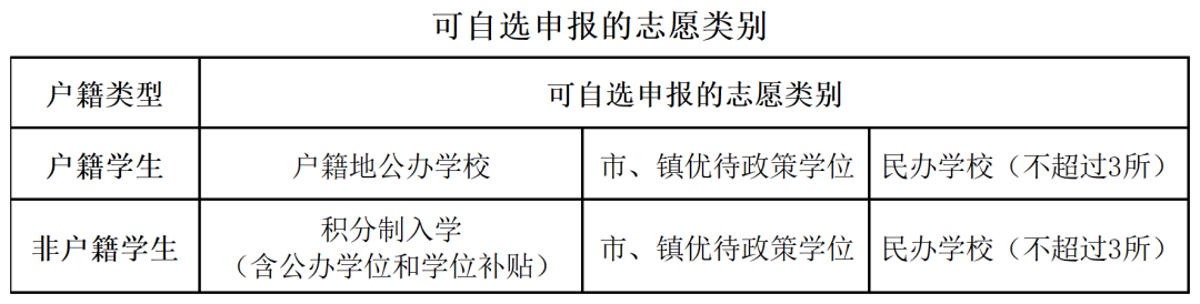 户籍学生:可自选填报“户籍地公办学校”“优待政策学位”或“民办学校”等志愿类别中一项或多项学位;