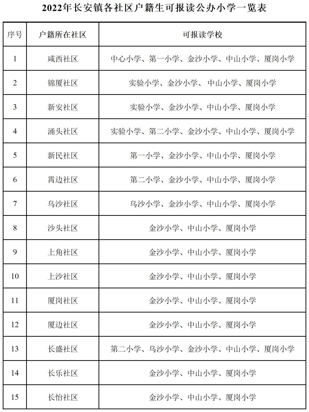 备注:以上户籍所在社区对应分配学校仅限起始年级。小学一年级根据其户籍所在社区归属,结合居住地(已办理房地产权证/不动产权证或购房合同备案的住宅,且产权属申请方所有)分配对应的学校,如不能提供有效产权证明的,则根据申请方入户时间先后顺序,结合志愿填报情况安排。