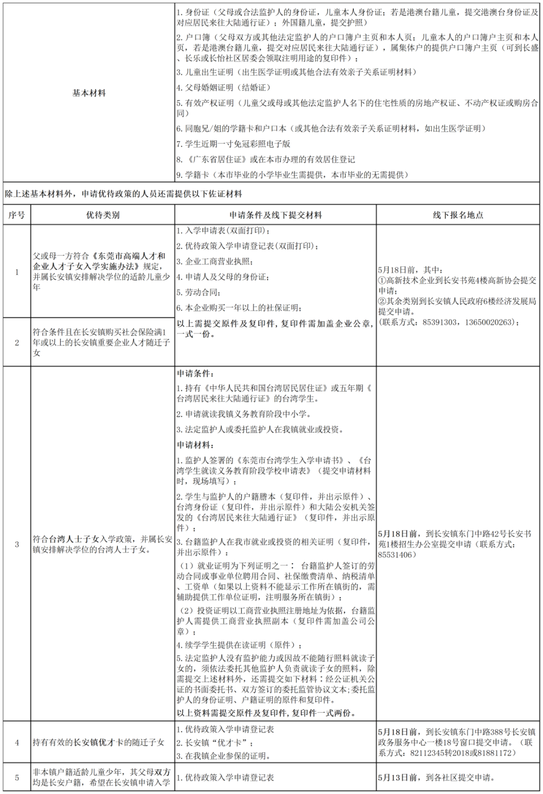 (1)高端人才和企业人才、重要企业人才子女。符合条件的企业人才随迁子女,需于5月18日前提出申请。其中,高新技术企业到长安书苑4楼高新协会提交申请,其余类别到长安镇人民政府6楼经济发展局提交申请(联系方式:85391303,13650020263);