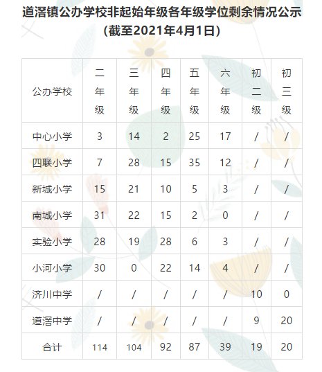 2021东莞道滘非起始年级公办学校剩余学位数情况