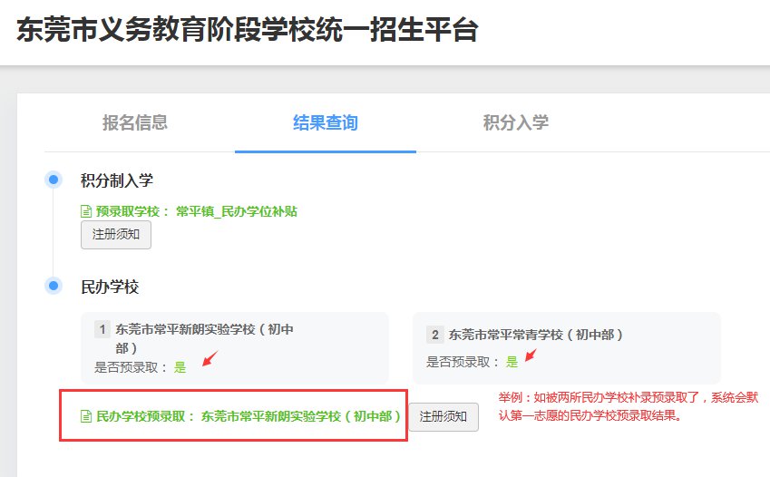民办学校第一轮补录工作(简称“一轮补录”)结束,各家长可以登录东莞市义务教育阶段学校统一招生平台(简称“招生平台”)查询民办学校一轮补录录取结果,并按要求注册缴费!仍未有录取结果或逾期未报名的学生,可联系仍有剩余学位的民办学校进行二轮补录。