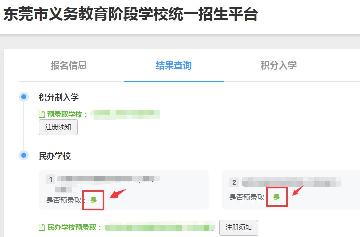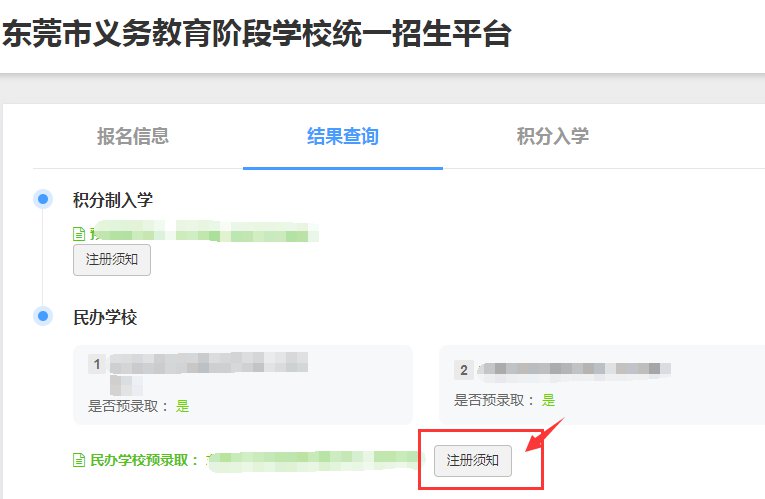 答:各民办学校会通过短信、电话、公众号的方式通知被录取的学生家长注册缴费的时间和要求,请各家长留意;各家长也可以登录“招生平台”-“结果查询”页面,点击查看预录取结果学校的“注册须知”(见下图)。