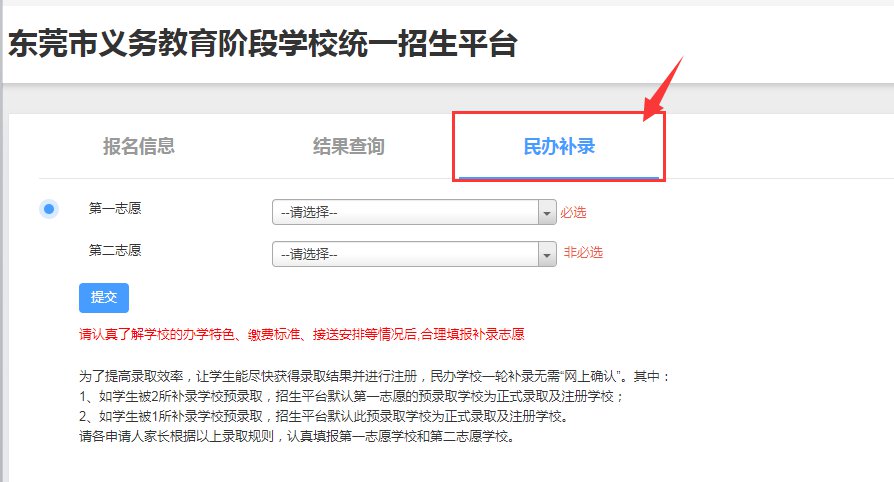 未在招生平台报名或未注册的申请人家长请在7月23日9:00—24日17:30登录招生平台填报补录志愿。