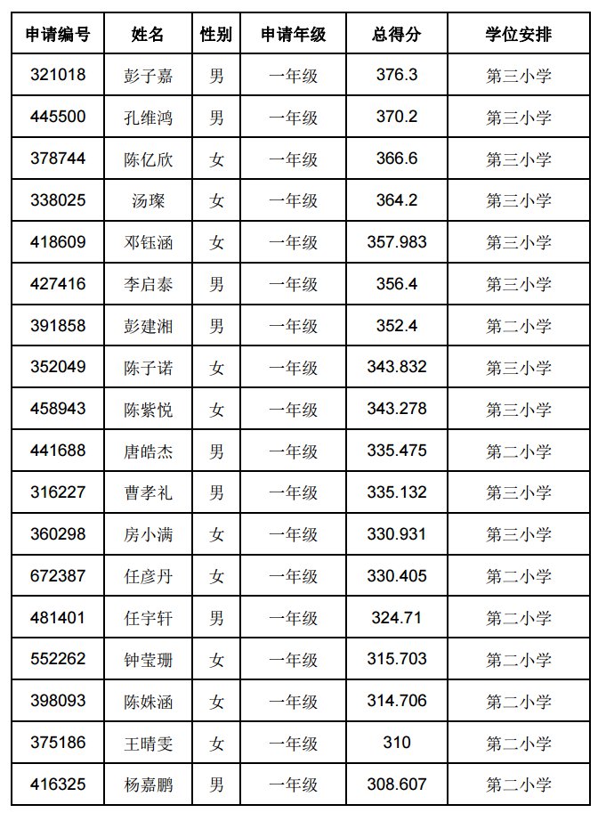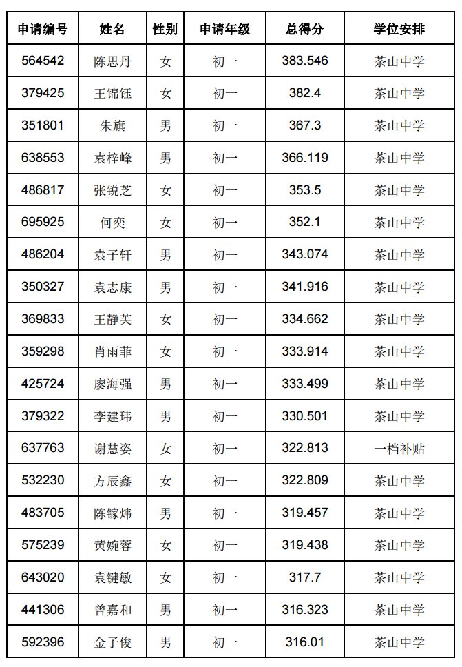 根据《东莞市非户籍适龄儿童少年接受义务教育实施办法》(东府(2020) 31号文件《东莞市义务教育阶段非户籍适龄儿童少年积分制入学积分方案》(东府(2020) 32号文件))有关文件规定,我镇已于2020年7月6日在“茶山教育”微信公众号对各年级申请人的积分、排名情况进行了公示。现公示期已结束,我镇根据申请人的积分、排名、志愿及学位供给情况进行录取公示,具体录取情况见附件。