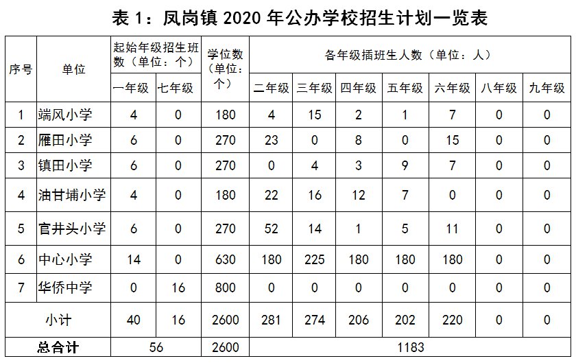 经调研,2020年全镇公办学校一年级和七年级(下统称:起始年级)共开设56个教学班(一年级40个班,初中16个班),可提供2600个学位(小学按45人/班,初中按50人/班测算,下同);起始年级同比增加13个教学班(小学新增9个班,初中新增4个班),累计新增605个学位;非起始年级可提供插班学位1183个,具体见下表: