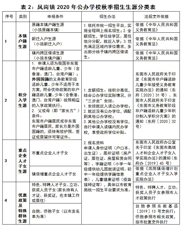 经研究,2020年公办中小学招生拟分“户籍生、优惠政策、重点企业人才子女、积分制入学指标生”等四个类别,具体分类情况、录取办法及政策依据见下表2。
