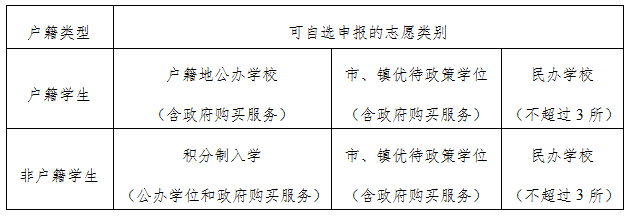 户籍学生:可自选填报“户籍地公办学校”“优待政策学位”或“民办学校”志愿类别中一项或多项学位;