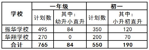 (2)招生计划和范围民办学校要严格按照办学规模规定确定招生计划。同时,应优先招收本校自愿报读直升一年级或初一的适龄儿童少年。振华学校和华翔学校的招生计划见下表: