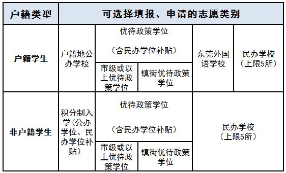 户籍学生:可自选填报“户籍地公办学校学位”“优待政策学位”“东莞外国语学校”或“民办学校学位”等志愿类别中一项或多项的志愿类别学位;